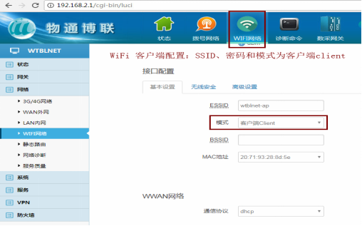 模式:客戶端Client(通過WiFi上外網請選擇client模式,如果是共享WiFi給其他設備請選擇AP模式)