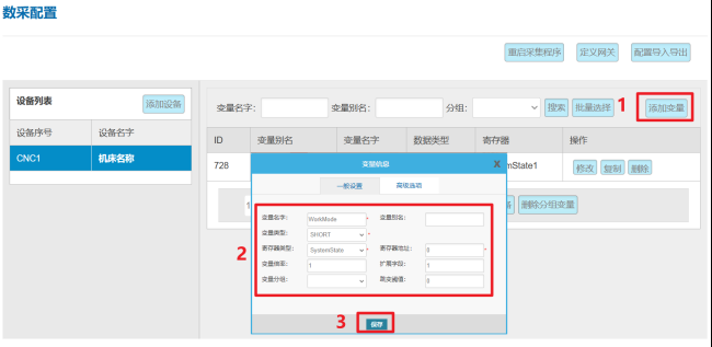 變量配置主要是定義變量名(自定義內容,不可使用中文命名)、變量別名(自定義,可使用中文名字)、寄存器類型和寄存器偏移地址,并定義一些數據規則(如:倍率、小數點、單位、告警)。