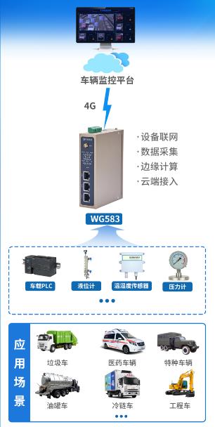 數據采集層:在排水搶險車上安裝物通博聯工業智能網關,該網關具備強大的數據采集能力,可接入車輛上的GPS模塊、控制器PLC、傳感器、發電機組等設備,實時采集車輛的位置、速度、油耗、發動機狀態、排水量等關鍵信息。